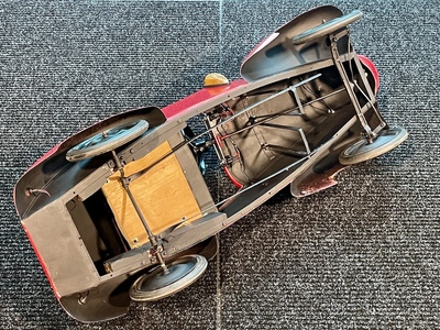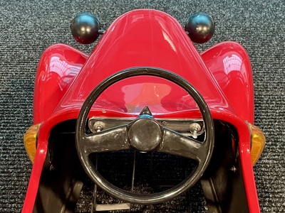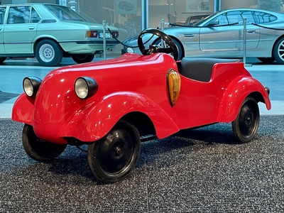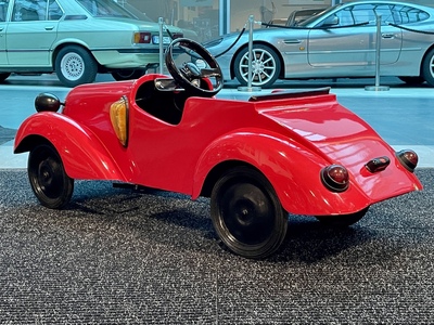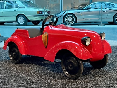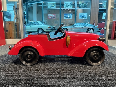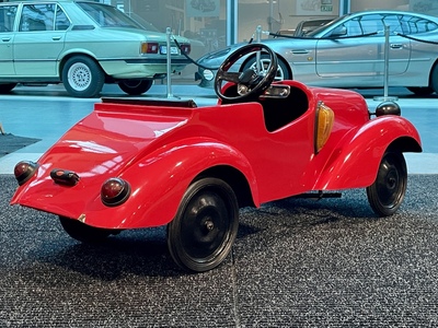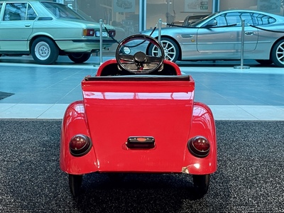 Although the Aero workshops were known primarily in the aviation industry, hundreds of children's pedal cars inspired by real cars were made here. Only a few rare specimens have survived to this day. The car was renovated a few years ago in ENGINE PRAGUE, including new red paint. Newly padded seat and backrest, dipped and turn signals are on, mechanically overhauled and fully functional. It has been used by children since then, so it bears signs of use. The dimensions of the car are 127 x 53 x 52 cm.