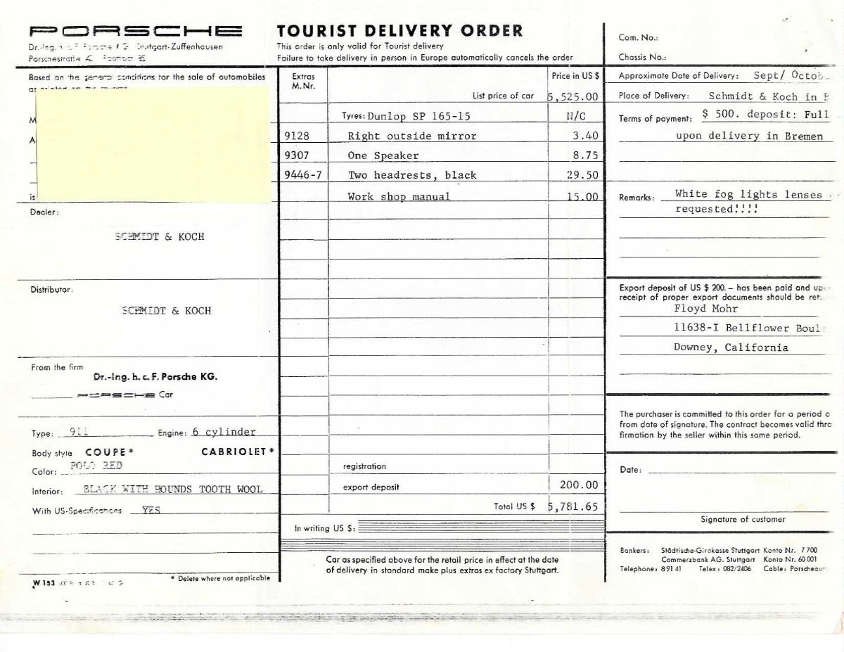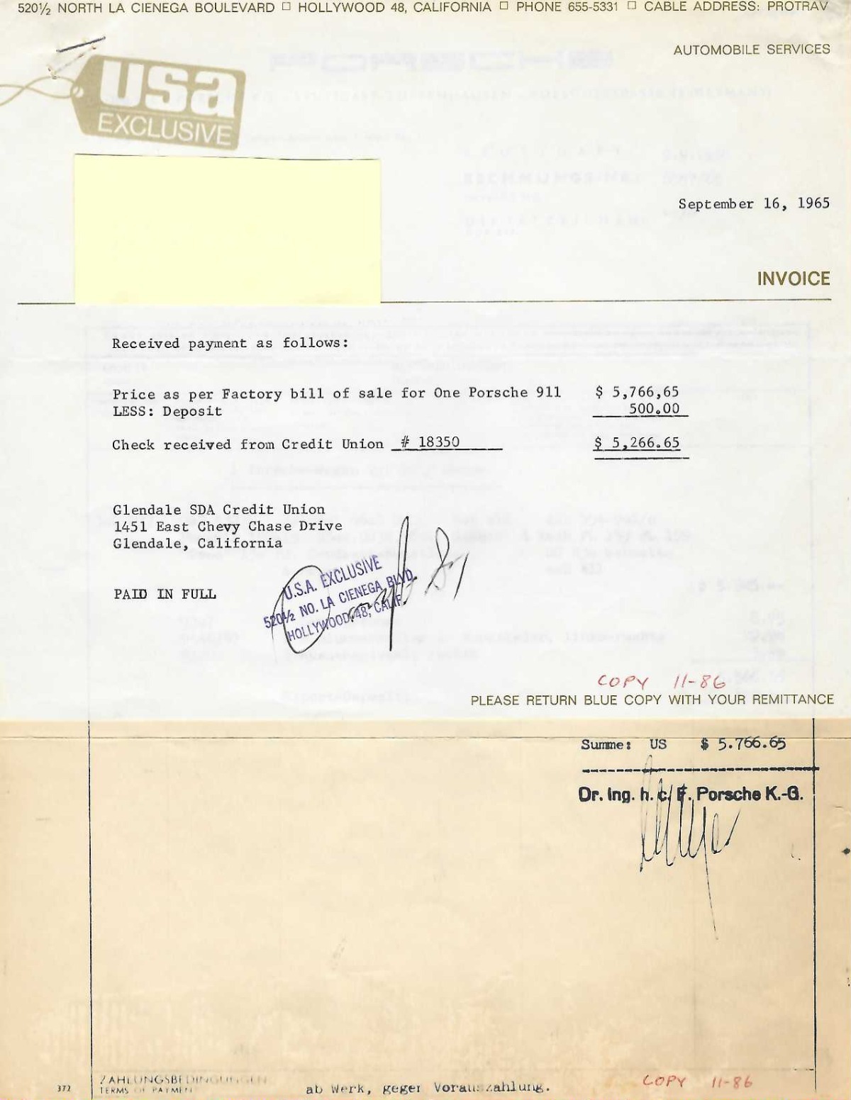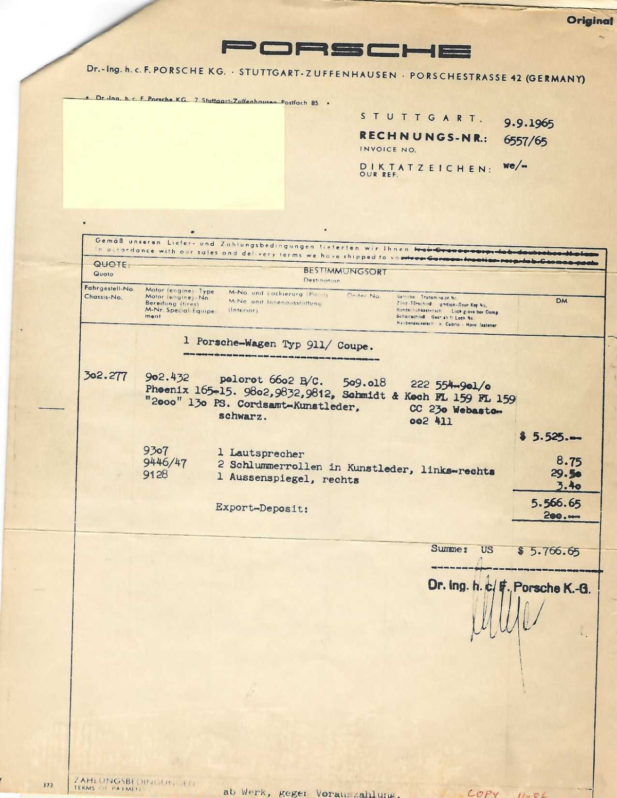 Velice vzácné Porsche 911 z prvního roku produkce legendární modelové řady 911. Jeho vzácnost spočívá v zachování naprosto originálního stavu, přičemž je stále plně pojízdné. Původnost dokládají signifikantní prvky jako mřížky u blinkrů či pět budíků v palubní desce. K vozu je k dispozici kompletní dokumentace - původní kupní smlouva s platebními údaji ze září roku 1965, exportní doklady z Německa do USA, servisní knížka a kompletní záznamy o provedených údržbách. Tato ucelená historie podtrhuje jedinečnost a činí z něj skutečný sběratelský skvost. Sběratelský svět vnímá tento originální stav jako sochu, kterou je třeba zachovat či velice citlivě renovovat.