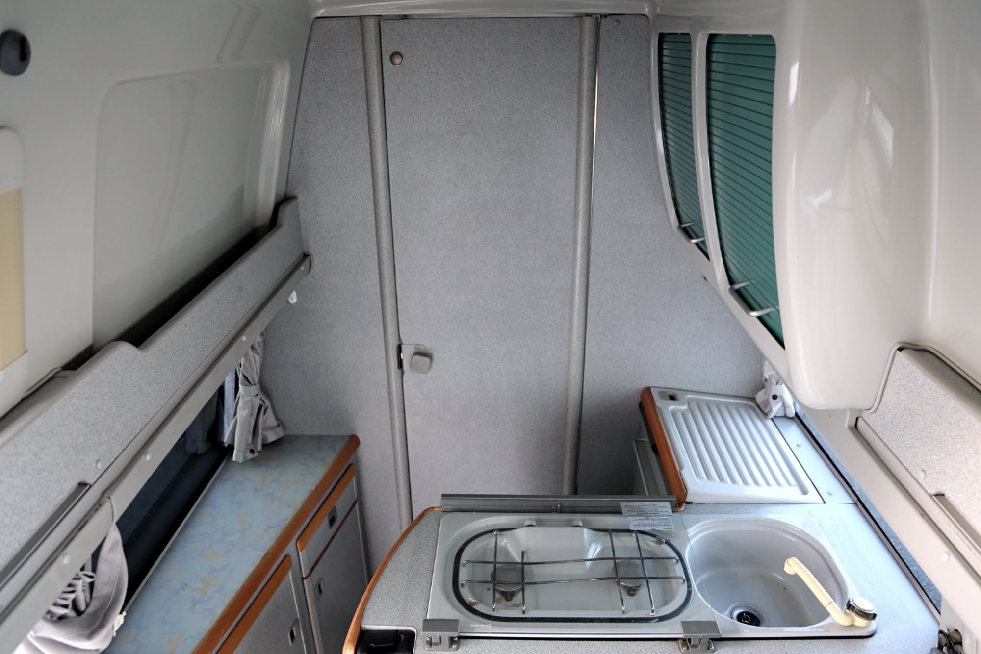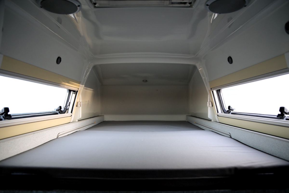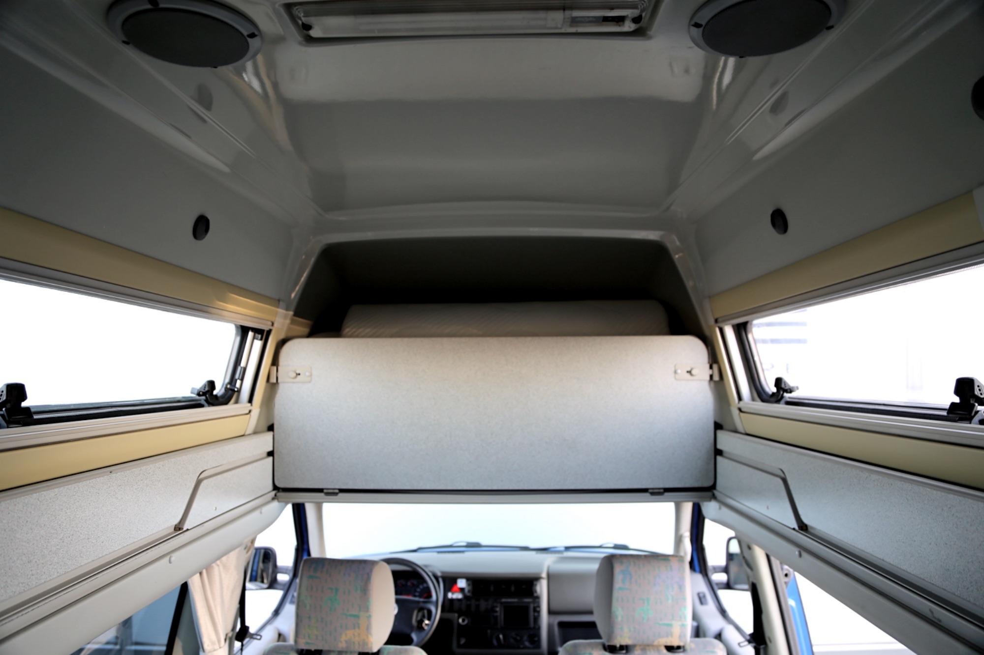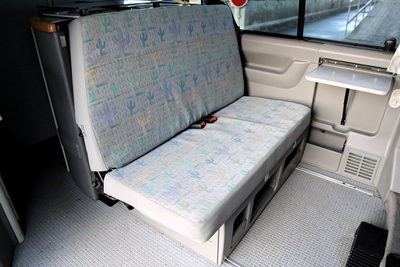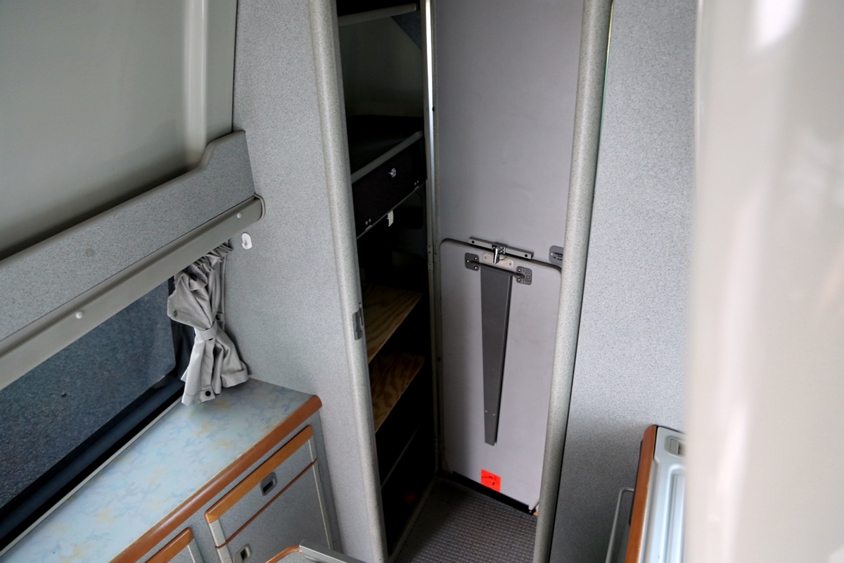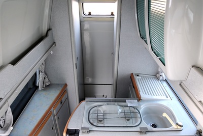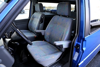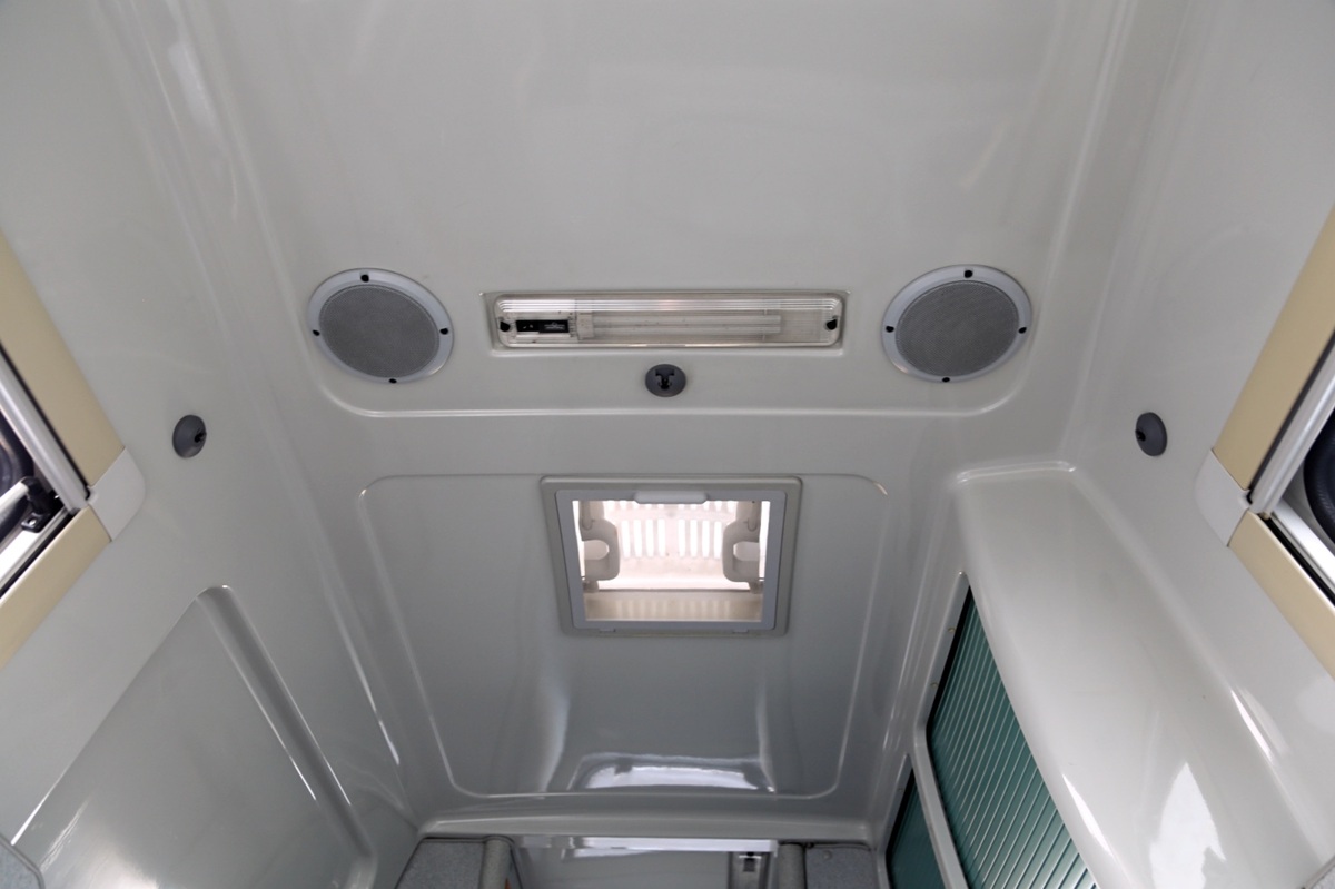 Interiér perfektně zachovalý, vše plně funkční. Výbava - lednice, plynový vařič, nezávislé topení, WC, umyvadlo, trezor, úložné prostory, malý a velký stolek, otočná sedadla, velká postel v nástavbě a rozkládací sedačka ve spodní části, výsuvná pergola - vše v originálním stavu. Počet míst k sezení: 4